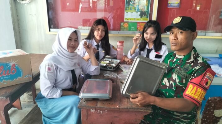 Seperti yang dilakukan Babinsa Koramil 0825/01 Banyuwangi Serda Moh. Hisyam Rosadi Babinsa Kelurahan Kebalenan, yang turut mendampingi kegiatan makan siang gratis di SMK Sritajung Banyuwangi, Senin (10/11/2025).