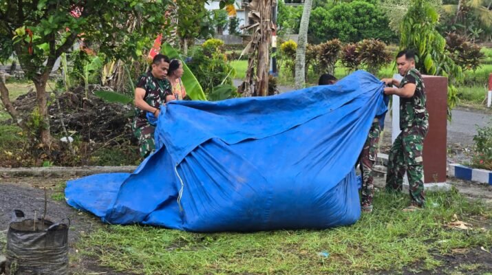 ​Melihat kondisi tersebut, tanpa menunggu perintah, beberapa anggota Satgas TMMD Kodim 0818 yang sedang beristirahat setelah bekerja keras di lokasi pembangunan drainase, segera berinisiatif membantu. Mereka berlari menghampiri lokasi penjemuran dan dengan sigap bahu-membahu bersama petani menutup padi dengan terpal.