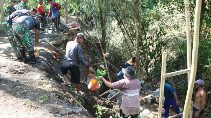 Sejak pagi hari, para prajurit bersama masyarakat bahu-membahu mengerjakan pembangunan TPT yang bertujuan untuk memperkuat struktur tanah serta mencegah terjadinya longsor, terutama saat musim hujan.