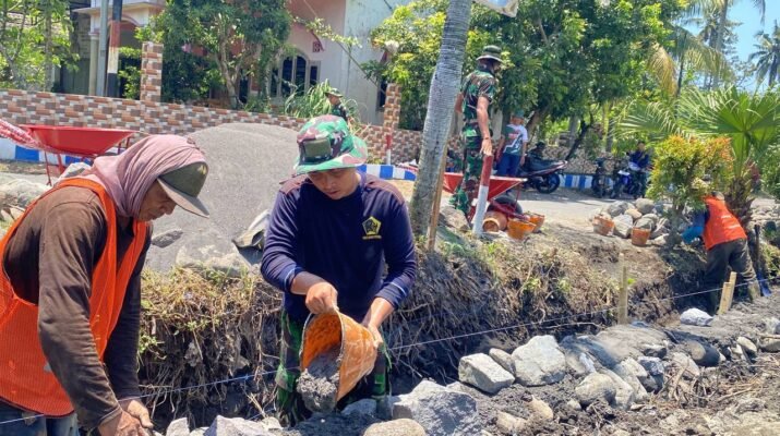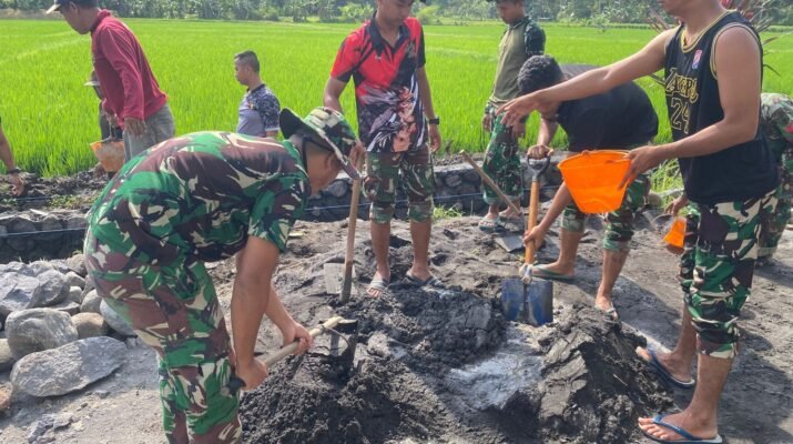 Anggota Satgas TMMD dari Kodim 0818/Malang-Batu yang berasal dari satuan Yonzipur 5/ABW, dipimpin oleh Sertu Agusti, bersama sejumlah personel dan warga setempat, bahu-membahu mengerjakan