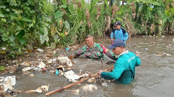 Di tengah genangan air keruh yang dipenuhi sampah dan lumpur, prajurit Satgas TNI Manunggal Membangun Desa (TMMD) Reguler Ke-127 Kodim 0819/Pasuruan turun langsung ke